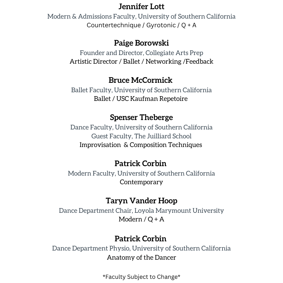 Both our Spring and Summer 2026 weekend workshops will bring Southern California's top college dance program professors and directors straight to you in Orange County, giving you an exclusive look into what it looks like and what it really takes to be a college dance major.